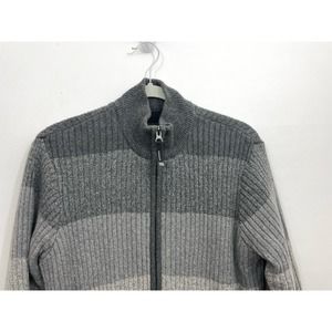 full zip gray striped sweater lined in fleece; slash pockets, may have minor random pilling; rib knit cuffs, hem and collar