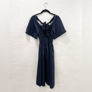 Condition is pre owned. No holes or stains. 100% Cotton. Navy. Open back with adjustable grosgrain ribbon tie. Ruffle flare sleeve. Smocking at waist for ease. Side seam pockets. Full circle skirt.