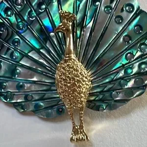 A stunning peacock design pin brooch, gold with beautiful marveled polished abalone shell. Good quality and great vintage condition.