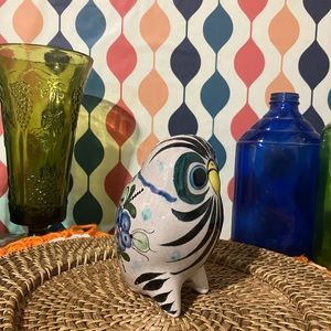 This small yet charming Mexican Tonala Pottery Owl features a lovely blue and white design adorned with pretty flowers in green and blue on an off-white background. Perfect for owl lovers, perch it on a stack of books on a shelf or tabletop for a pop of bohemian decor.