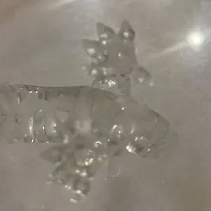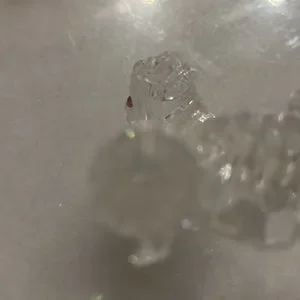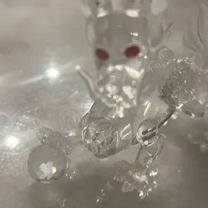 Clear faceted crystal, frosted mane and tail, red eyes.