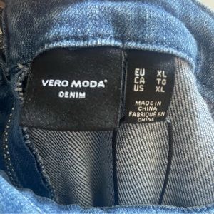 Short sleeve dramatic shoulders with scalloped neckline . Body con fit with zipper blue jean denim