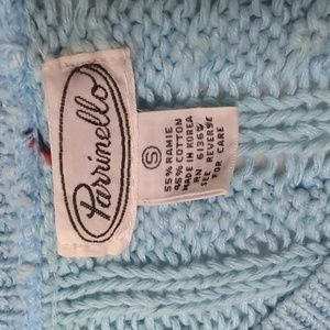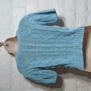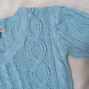 Chunky cable knit cropped sweater, vintage 80's, size small. V-neck. Light blue sky color. Solid, thick material and in great shape, no pilling or rips. Stretchy ramie/cotton blend.