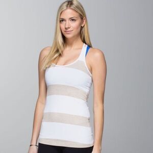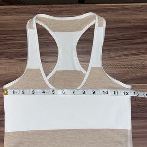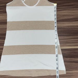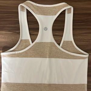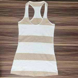 Tan and White striped racer back tank top. It doesn’t have a size tag. I am a size 6 in Lululemon, so I think that this a 4. This tank top is very stretchy.