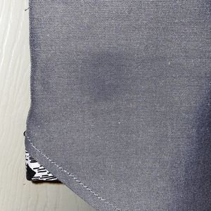 Stylish details at the button flap and collar panel. Small discoloration on back lower left side — see photos
