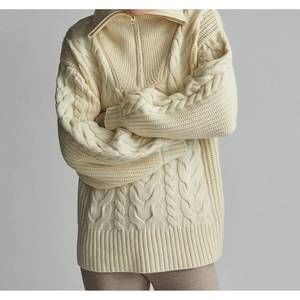 48% Nylon, 27% Viscose, 20% Wool, 5% Cashmere. Luxuriously soft, it is made from a blend of wool and enriched with a hint of cashmere, ensuring unmatched comfort. Its chunky, oversized silhouette is complemented by a cable knit design and exaggerated ribbed collar, adding a touch of sophistication to its relaxed charm. Zip closure. Elastic and ribbed cuffs.