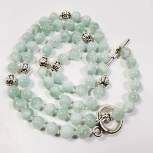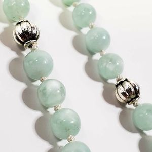 This beautiful necklace is made with rare green moonstone and hand-knotted pure silk cord. The silver-toned toggle and Tibetan silver spacers are lead and nickel free.