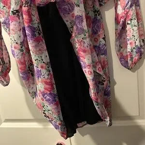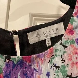 This sweet little dress is perfect for the upcoming springtime weather. Dress is by Wayf originally purchased at Nordstrom in a size small. Mini length with an elasticated waistband, long, sheer sleeves that are slightly bat wing. Body of the dress is fully lined. Beautiful floral pattern of pink, purple, green, black & beige tones. Flounce skirt style. I’m addition to wearing this on its own I loved to wear it with a cropped sweater over top with some cowboy boots. In very nice pre worn condition.