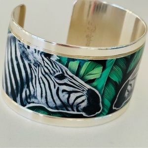 Zebras and foliage on this Brighton cuff add a sense of fun and adventure. Multiple layers of clear enamel are applied on the original artwork, giving it the rich dimensional effect of the centuries-old decoupage technique.