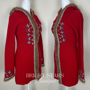 Knit, Red, Knitted, Vintage, Embroidered, Embroidery, Faux Fur, Trim, Hood, Hooded