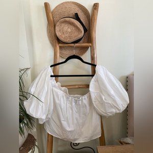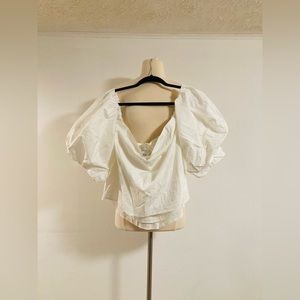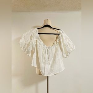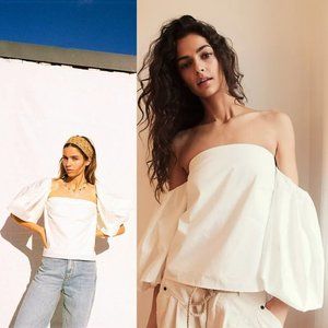 This gorgeous, cotton-feel top is featured in an off-the-shoulder silhouette with dramatic puff-sleeve detail and separate arm hole for a rise-free fit.