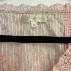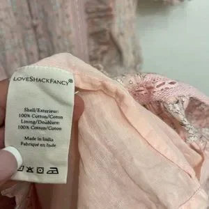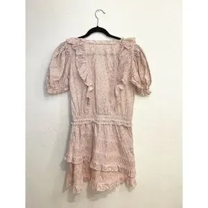 Condition is pre owned. No holes or stains. Sutton Dress in custom dobby cotton with subtle striping beneath a ditsy floral print features center front buttons extending from the scalloped neckline to the shirred elastic waistband with raw ruffled edges. Vertical panels of inset lace line the bodice alongside gathered ruffles that extend over the shoulders. Puffed sleeves narrow to elastic armholes at the mid-upper arm. The slim fit skirt is lined with inset lace and short ruffles for a romantic twist. Ends at mid/upper-thigh.