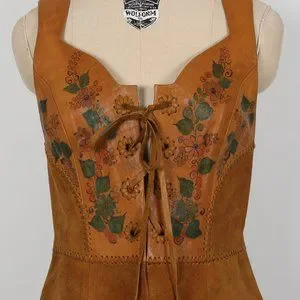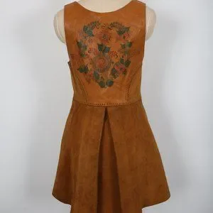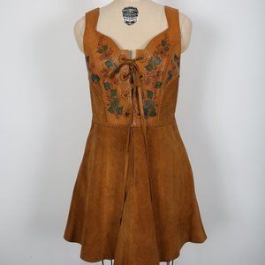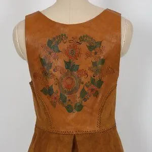 Vintage CHAR Leather Dress 70s Hippie Boho Handmade Hand Painted Florals