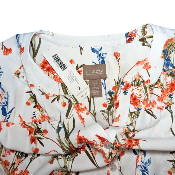 Chico's 2 (XL) NWT White Floral Short Sleeve Button Front V-Neck Blouse