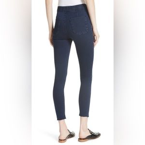 The Easy Goes It skinny pants are a super soft, super stretchy high rise jegging with an elastic pull-on waist, back patch pockets, and raw hem detailing in a dark blue wash. A figure-flattering pull-on jean pant with real, functional back pockets and a comfy stretch fit. These denim leggings are made from a power performance fabric that will hold its shape throughout the day, so they won't bag out.
