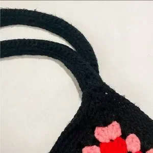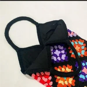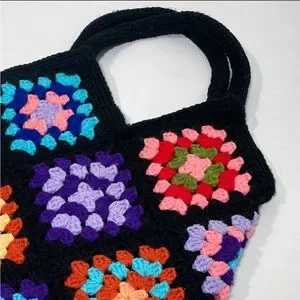 Vintage Crochet Rainbow Granny Square Small Tote Bag with Lining and Pocket