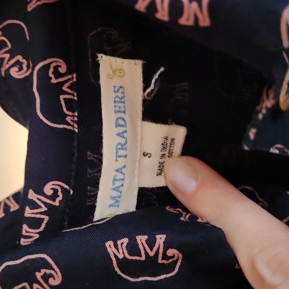 Long-sleeve button down dress in the cutest elephant print. Navy fabric with mustard yellow/gold elephant print. Dress has pockets and is in excellent condition! Size small