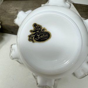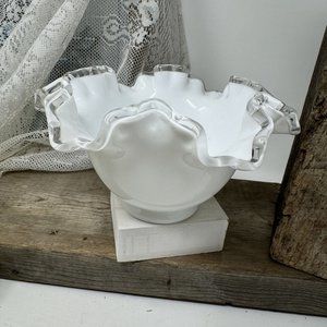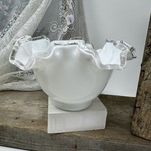 This vintage Fenton glass bowl is a beautiful double crimped round design. Its timeless elegance and careful craftsmanship make it a standout piece for any collection or decor.