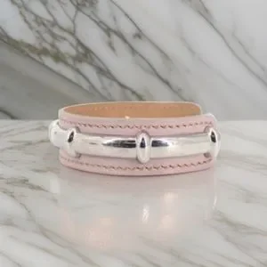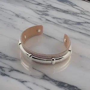 Hermès Agatha Bamboo Leather Bracelet Cuff Material: ssoft pink leather & high polish palladium-plated metal Weight: 23.2 grams Diameter: 2.5" Width: 0.60" Signed: "Hermes Paris Made in France"