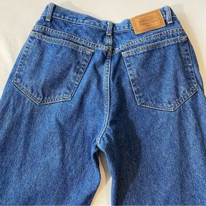 Vintage Calvin Klein blue denim jeans size 14. High waist straight leg rigid denim. Five pockets. Union tag made in USA 100% cotton. Good preowned condition.