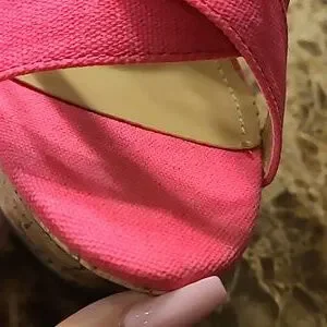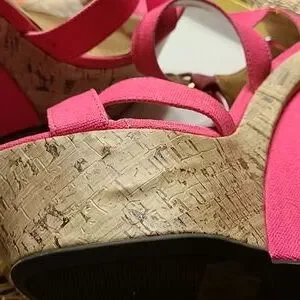 new inbox never worn only tried on gorgeous pair of hot pink denim wedges. these babies have a 6-in heel with a 2-in cork platform. they are new and have been sitting in a box there are two little call outs that I pointed out in the photos One looks like a slight dirt smudge and the other just an imperfection color on the cork. Not noticeable when Warren. they're also is on the right shoe in our platform where the cork looks slightly warped but again not noticeable at all.