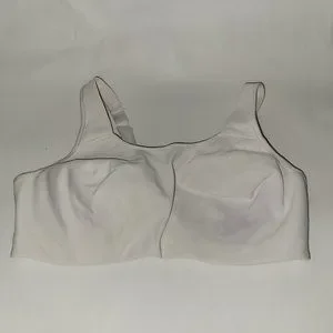 6. Moving Comfort white bra wit triple hook clasp in back and underwire 36D - light wear and faint bluish stain on left cup
