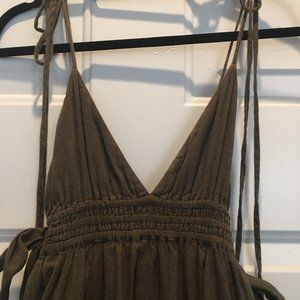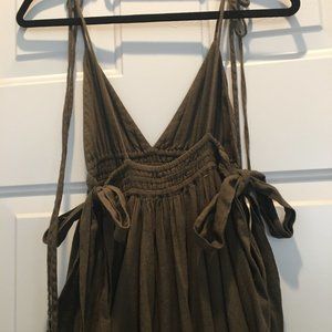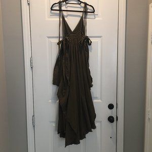 Free People dark olive green dress with shoulder ties, uneven fringed hemline