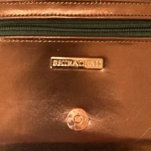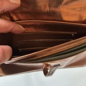 Copper vegan leather wallet/wristlet. Wristlet strap is detachable. Loop & strap closure on front & magnetic snap closure. Inside is 1 zipper pocket, 3 card slots & 1 bill pocket.