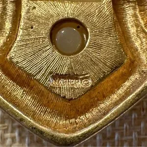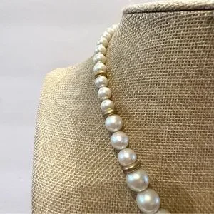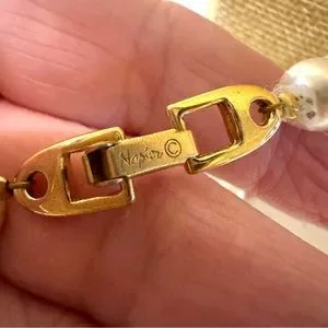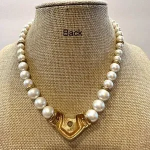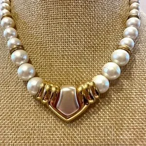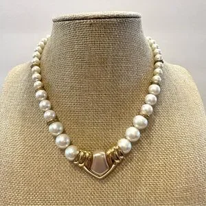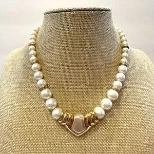 Vintage 1980’s Napier Necklace faux pearls, gold tone comes to a point, “V”