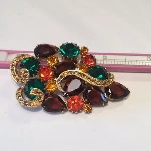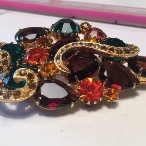 Vintage gold tone, multi colored crystal rhinestone 2.5” prong set brooch. Excellent condition. Beautiful detailing.