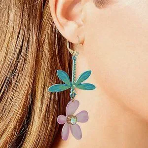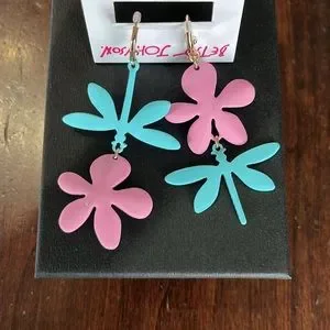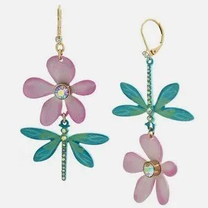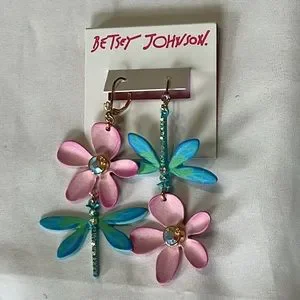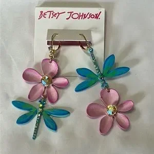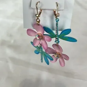 Betsey Johnson Dragonfly and Flower Mismatch Drop Earrings Gold Pink Blue NWT