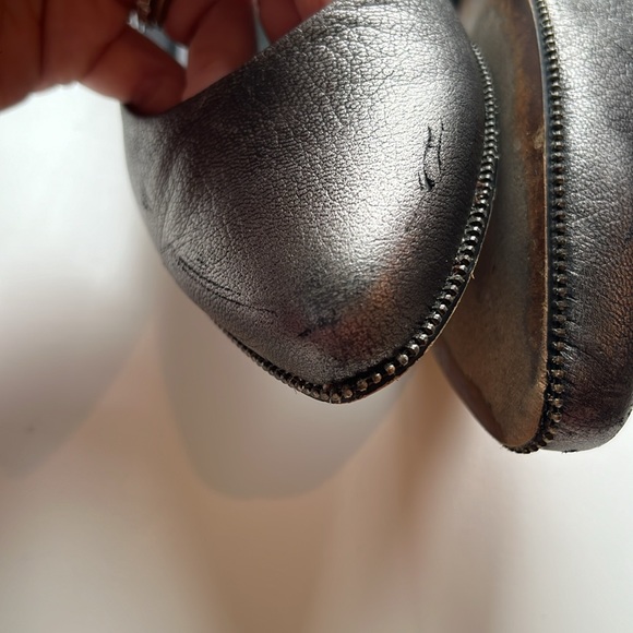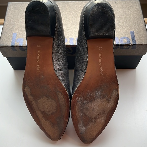 Very good condition Luxury Rebel women’s pointed-toe, pewter flats with small square heel. Size 39 or around an 8.5 women’s in US. Only worn 1-2 times (w peds) before I realized these were too small (I typically wear a sz 9 shoe). Minor signs of wear - see pictures for reference.