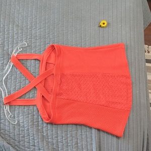 Fairly stretchy and comfortable. Thick criss cross straps. Red color with almost orangy tinge, I would call it poppy red in my opinion.