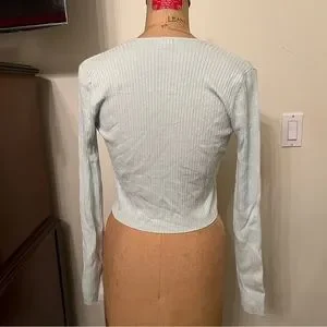 A ribbed cropped fly away open tie cardigan from Garage. This pale blue long sleeve sweater has an open tie front and ribbed silhouette. A very soft and comfortable material and easy to throw on with anything. It can easily be dressed up or down depending on the occasion. It can be worn by itself or as a layering top. A size Small, but will best fit a XS-Medium depending on preferred fit. Made from 60% Viscose and 20% Nylon. No significant wear to flaws noted.