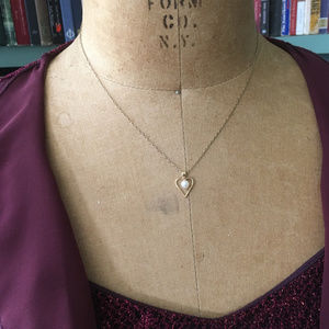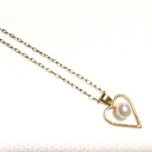Vintage necklace sits beautifully on the neck. Single pearl is 1/8” in diameter, sitting in a gold heart. Piece is from the 1960s, not worn since then. Note that one jeweler told me the heart was 14K--and another one today said it is gold plated. So: sold as is, whatever it is. Both the spring-ring closure and the 16.5" chain show slight wear, indicating gold plate. You could replace it. Very pretty necklace, very delicate-looking, and in VG used condition.