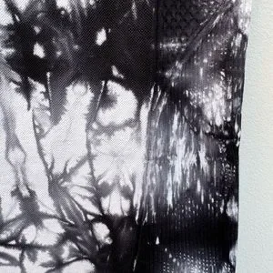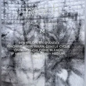Really comfortable high waisted leggings with no seams at the waist or outside of leg. (Seams only at the inseam). Very cool marble pattern. Ribbing at waist, hips and tops of thighs. Super soft and stretchy, made of 94% nylon and 6% spandex