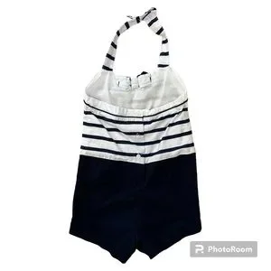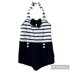Janie and Jack navy blue and white striped nautical romper with halter neckline. Size 3T, only worn maybe 4 times. Halter has button closure and the back has a 3 button closure. Adorable outfit that’s perfect for the Summer!