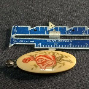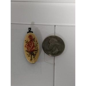- The pendant features a miniature pink rose meticulously hand-painted on a wooden oval surface.