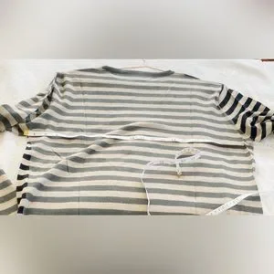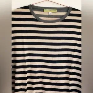 No, you’re not seeing things. This sweater is black and cream stripes on the front, gray and cream stripes on the back. Unique and very cool, it’s a cashmere and cotton blend, summer weight. NWOT and in very good shape, never having been worn. It is a size large, with 22 inches, length 28 inches. By Armand Diradourian in Paul Smith style for Paul Smith. Great for sailing or any other spring, summer, fall activity.