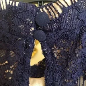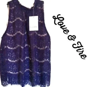 LOVE,FIRE Dark Blue Eclipse Lace Sleeveless Top over Nude underlay. Two Covered buttons secure the back. Scalloped Lace at the bottom finishes this great look! Measurements: Chest 16β across, Length 23β at longest Lace scallop. Size XS. Please chest measurements- can fit small. Brand New W Tags. Nordstrom Juniors Buy It Now Priceππ Summer Party Halter Vacation Blouse