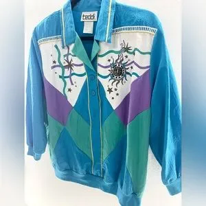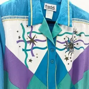 Vintage 80s Teddi Celestial Collared Blouse X Large Moon Stars Turquoise Purple