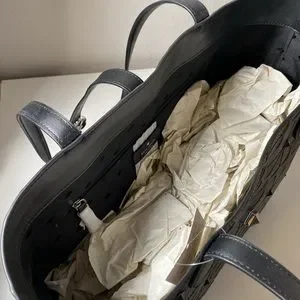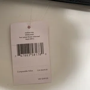 9"h x 13"w x 5"d drop length: 9.5" smooth leather foil embossed logo open top tote interior zip pocket dual interior slide pockets style # wkru6483Z Color: Black