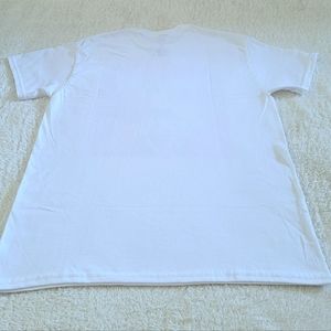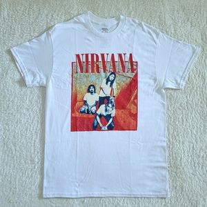 White tee👕 with "NIRVANA"☸️ in bold letters on front with band members Dave Grohl, Krist Novoselic and Kurt Cobain