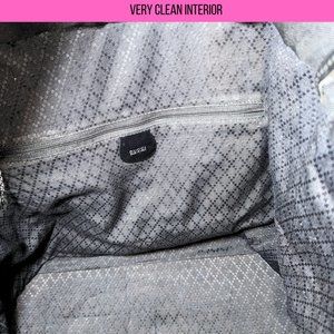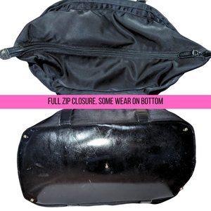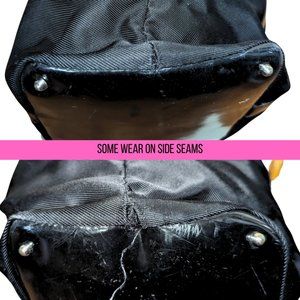 This tote is in great shape overall! The lining is very clean with no holes or tears. The exterior has minor signs of wear as seen in pictures. There was a repair to one of the handle attachments at some point. The bamboo handle must have broken and someone glued it back together. The handle is very sturdy. It doesn't wiggle at all. Bamboo handle replacements can be purchased on the Internet if you want to fix the handles properly.