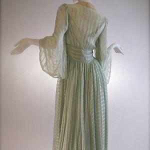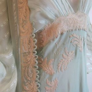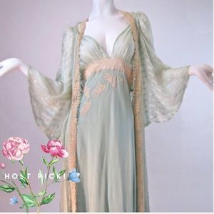 Heirloom Vintage 1930’s Bridal Trousseau Silk Peignoir Set Nightgown and Robe Channeling the Greek Goddess Athena. This is a piece of collectible, wearable art! This was purchased from Salon of the Dames in 2016 and has been safely stored and unworn since. Please note that this item is nearing a Century in age and does have minor reflections of its age. Based on age it’s condition is remarkable. There is a 1cm mark on the middle of the skirt at the back. A small amount of fray near straps.