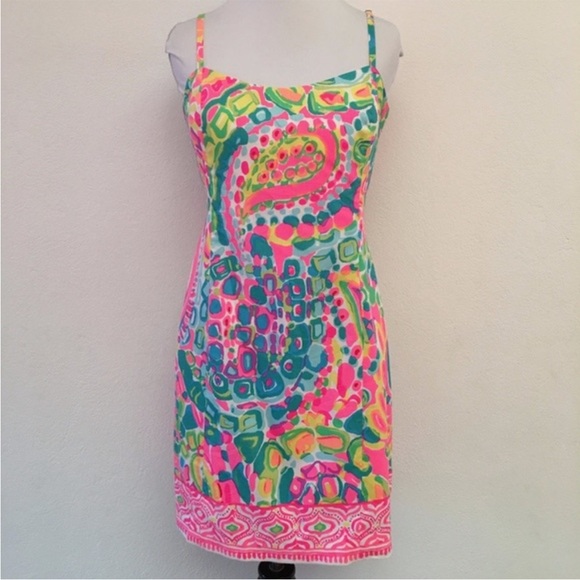 The Shelli Dress is a strappy, fun and fitted shift dress. The engineered print on this dress makes it an instant party outfit. The Shelli Dress is a strappy, fun and fitted shift dress. The engineered print on this dress makes it an instant party outfit. Spaghetti strap Colorful, neon design Tieback Back zipper Sweetheart neckline. Fully lined. Padded bra area. Mini length, garment has limited stretch