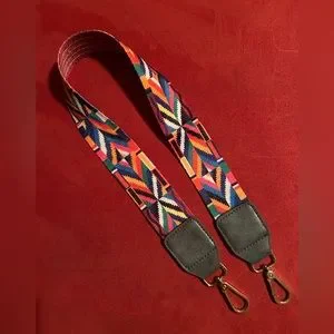 Handbag, shoulder strap, 27” long Once I displays a beautiful array of colors, the other red and brown stripes Gray leather accents and gold hardware