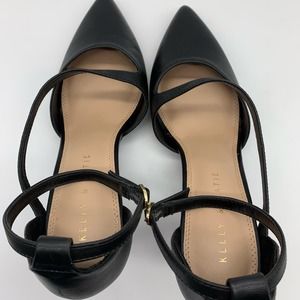 Kelly & Katie Pointed Toe Black Strappy Black Pumps With Gold Trim Heel Sz 10M. In great pre-owned condition. There is a small area of peeling on one of the toes (pictured). See photos for details on condition. 4" Heel.