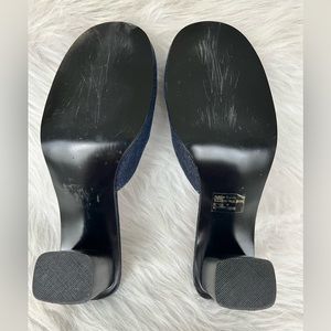 Fun Y2K denim crosstitch embroidered block heel mules
