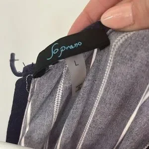 Size large navy and white striped jumpsuit with cute bow tied in front. Note: button loop in back broke, so you’d need to sew that together ◡̈